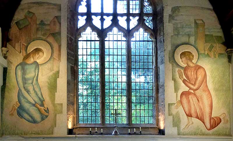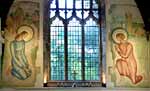 Painted by Evelyn Gibbs (1905-91) and Claude Price in 1946. The mural depicts The Annunciation and is in two parts: the Virgin Mary on the left-hand side of the east window and the Angel Gabriel on the right. Gabriel is informing Mary that she will give birth to Jesus, the Son of God. The background scene shows Bilborough church and village with Wollaton Hall visible in the far distance.