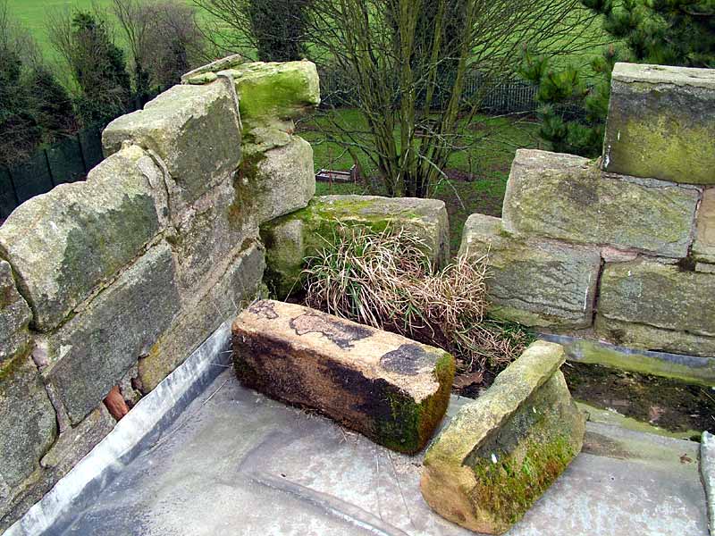 and brickwork blocking the tower arch and the brick chimney in the tower.