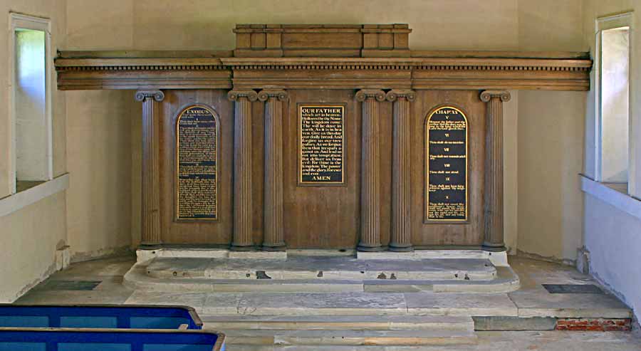 The Listing Description describes the reredos as ‘an Ionic screen five steps up, with dentil cornice and central rectangular board flanked by single arched boards, all printed with biblical texts.’ The texts are the Lord’s Prayer and the Ten Commandments.