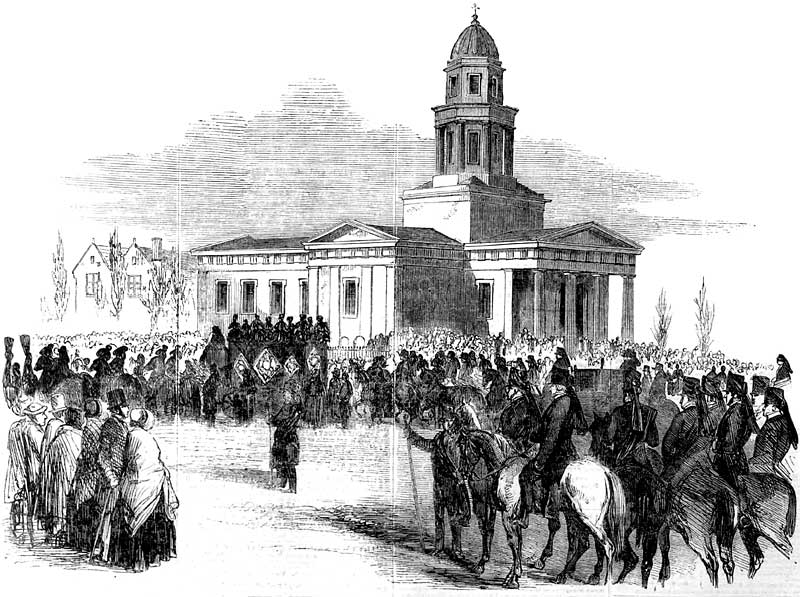 ‘A few days after death, his Grace's remains were placed in a shell of Spanish mahogany, lined with rich white satin ; this was ultimately placed within a leaden coffin, and encased in the outer coffin of Spanish mahogany, covered with crimson Genoa velvet, having eight massive handles, with a coronet over each: the lid studded with gilt stars, and having upon it the breastplate, with a coronet above and below. These were made by his Grace's tradesmen, at Clumber. Upon the plate was the following inscription:—“Henry Pelham Pelham Clinton, Duke of Newcastle and Earl of Lincoln, Knight of the most noble Order of the Garter, eldest son of Thomas, third Duke of Newcastle, and Anna Maria, fifth daughter of William, second Earl of Harrington, born 30th January, 1705, died 12th January, 1851.” The above was surmounted with the Noble Duke’s arms, supporters, crest, coronet, &c.’