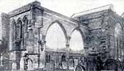 George Parkyn’s aquatint of 1815 shows the low-pitched aisle and nave roof evident in Buck’s engraving, although fewer pinnacles, suggesting that they had fallen down or been demolished during the 18th century. The aquatint shows the east window and those in the east ends of the north and south aisles, and heavy buttressing to the wall of the north aisle, where the cloisters would originally have adjoined. The gallery windows to the north side of the nave are visible, indicating a low roof to the north aisle. More masonry had been lost from the Lady Chapel by this date.